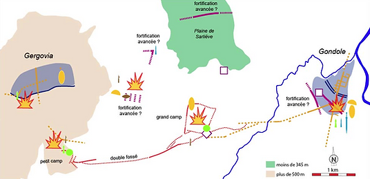 La mise au jour de nouveaux vestiges immobiliers (fossés, sépulture humaine et ensevelissements de chevaux, tronçons de voies) et mobiliers (militaria tardo-républicains) permet en effet de mieux cerner l’emprise du champ de bataille. Elle conduit à formuler des hypothèses nouvelles quant au déroulement du siège de l’oppidum."